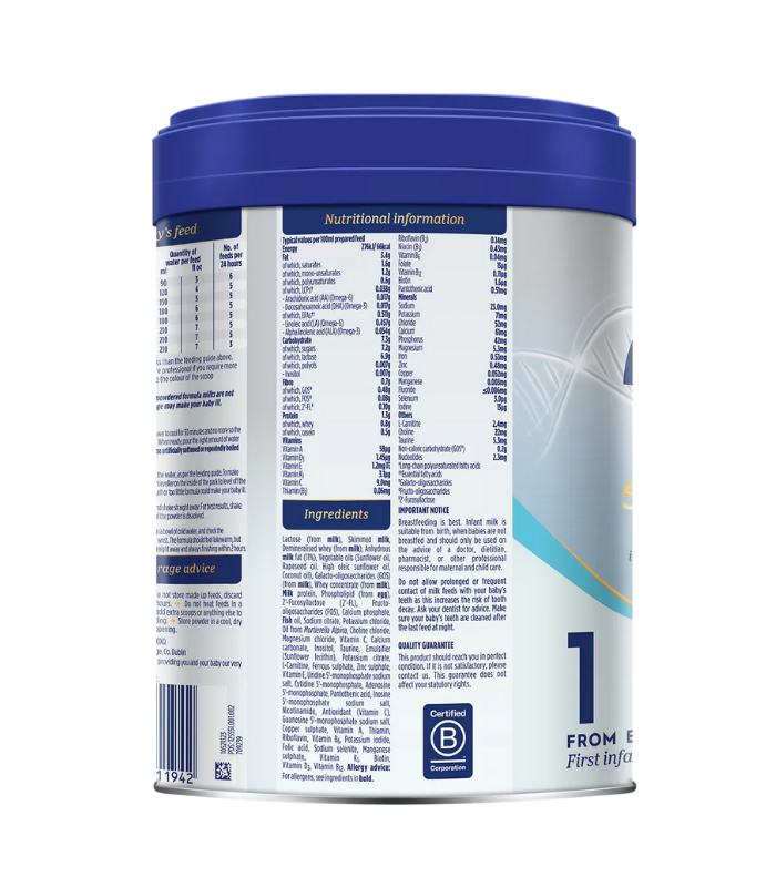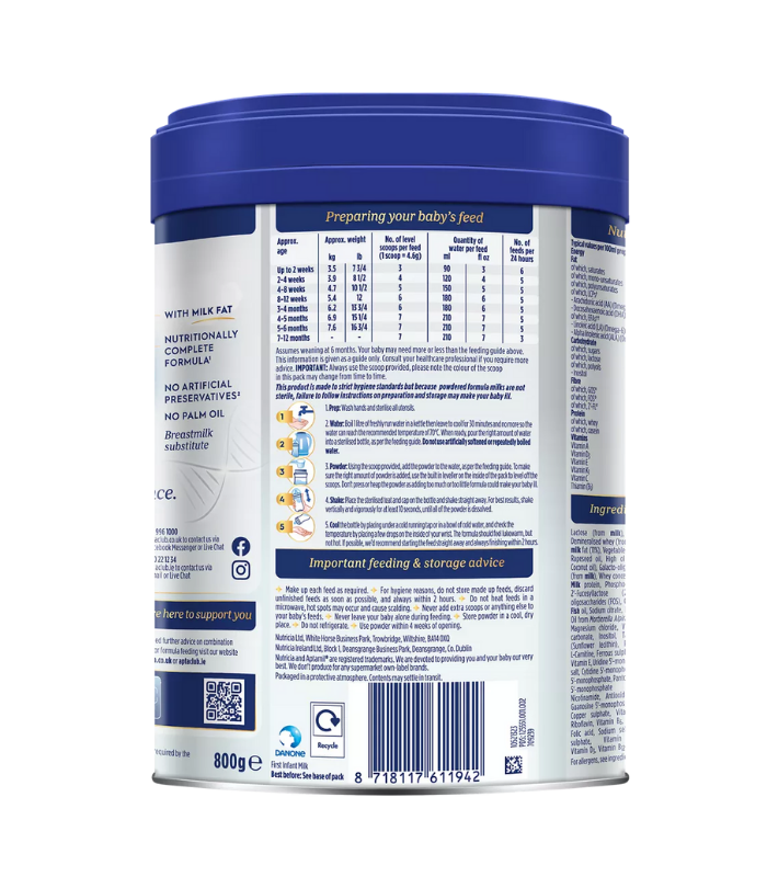 IMPORTANT: Always use the scoop provided, please note the colour of the scoop in this pack may change from time to time. 1. Wash hands and sterilise all utensils according to manufacturers’ instructions. 2. Boil 1 litre of freshly run water. Leave kettle to cool for 30 minutes and no longer. Measure the required amount of water (refer to feeding guide) into a sterilised bottle. Be careful of scalding. Do not use artificially softened or repeatedly boiled water. 3. Using the scoop provided, level off the powder with the built in leveller. Do not press/heap the powder. 4. Add the correct measure of powder to the water. Adding too many or too few scoops can be harmful. Place the sterilised teat and cap on the bottle and shake immediately, vertically and vigorously for at least 10 seconds until the powder is dissolved. 5. Cool under running tap. Check temperature of feed. Feed immediately. IMPORTANT FEEDING ADVICE Make up each feed as required. For hygiene reasons, do not store made up feeds, discard unfinished feeds as soon as possible, and always within 2 hours. Do not heat feeds in a microwave, hot spots may occur and cause scalding. Never add extra scoops or anything else to your baby?s feed. Never leave your baby alone during feeding.