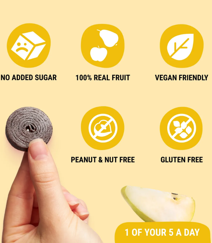 Bob Snail snacks are made from 100% fruits and berries with no added sugar. They’re free from cereals containing gluten, crustaceans, eggs, fish, peanuts, soy, milk, tree nuts, celery, mustard, sesame, sulphur dioxide/sulphites, lupin, and molluscs. Pure fruit, nothing else!