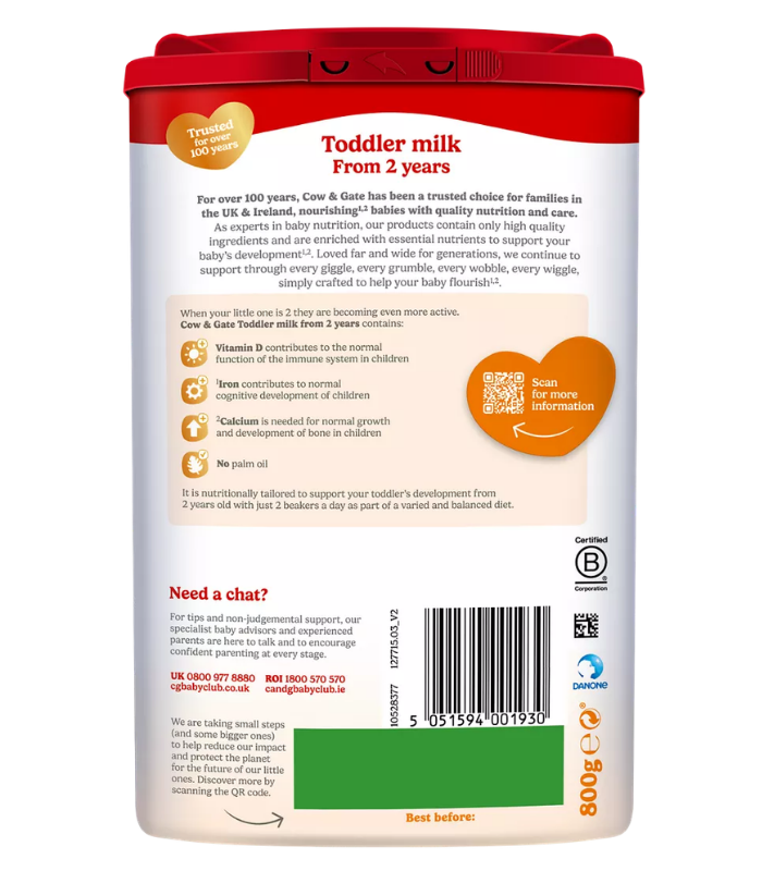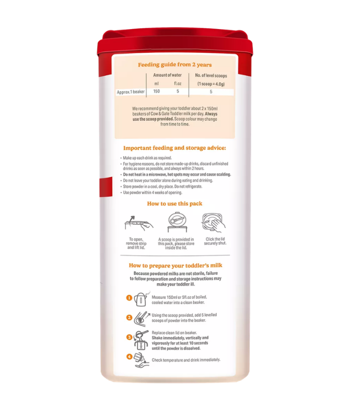 We recommend giving your toddler about 2 x 150ml beakers of Cow & Gate Toddler milk per day.