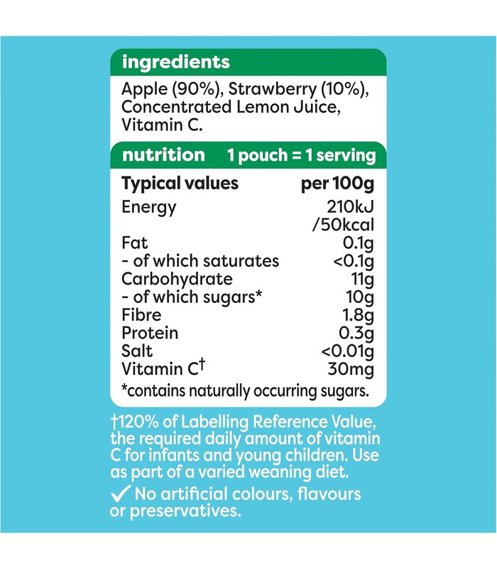 A smooth blend of apple & strawberry with added vitamin CSimply made with love and nothing else added, we select the tastiest ingredients from nature for your little one!Use as part of a varied weaning diet.Heinz Apple & Strawberry Baby Food Fruit Puree Pouch 6+ Months 100g. Simply made with love and nothing else added, we select the tastiest ingredients from nature for your little one!Nappies? Check. Bib? Check. Heinz pouch? Check! Always have a tasty meal to hand with our Heinz Apple & Strawberry Baby Food Fruit Puree Pouch 6+ Months 100g.Squeezable, resealable and packed with nutritious goodness – perfect for meals on the go with your little one.Squeeze contents into a bowl or straight onto a spoon. Never microwave the pouch and always ensure your child is supervised when eating.1 of your baby’s 5 a dayNo artificial colours, preservatives or flavoursLow in salt and absolutley no added sugar