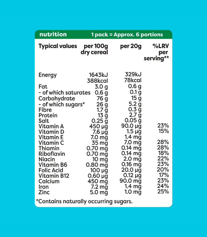 Typical Values | per 100g dry cereal | per 20g | %LRV per serving** |