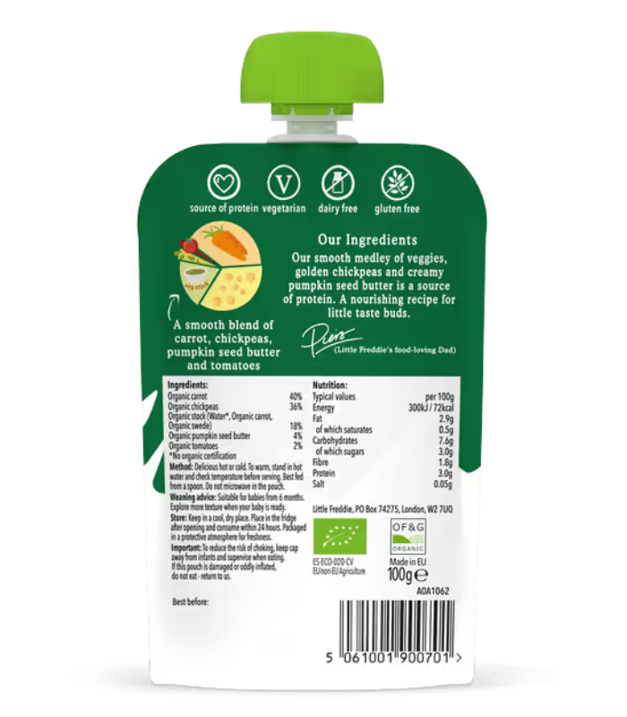 A smooth blend of carrot, chickpeas, pumpkin seed butter and tomatoesOur IngredientsOur smooth medley of veggies, golden chickpeas and creamy pumpkin seed butter is a source of protein. A nourishing recipe for little taste buds.Piers(Little Freddie’s food-loving Dad)